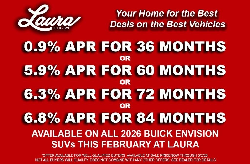 #1 VOLUME BUICK-GMC DEALER IN THE NATION!! 1000+ NEW VEHICLES IN STOCK! HOME DELIVERY AVAILABLE! You could qualify for even more incentives, please call dealer for details. Priced below KBB Fair Purchase Price! Preferred Equipment Group 1SU. You pay the price listed plus a $377 documentation fee, applicable tax, title and license less any extra incentives if available and/or applicable. Please call 618-344-0121 for more details! Laura Auto Group, serving our communities for over 44 years. Please call dealer to verify vehicle availability. Price good through 3/2/26